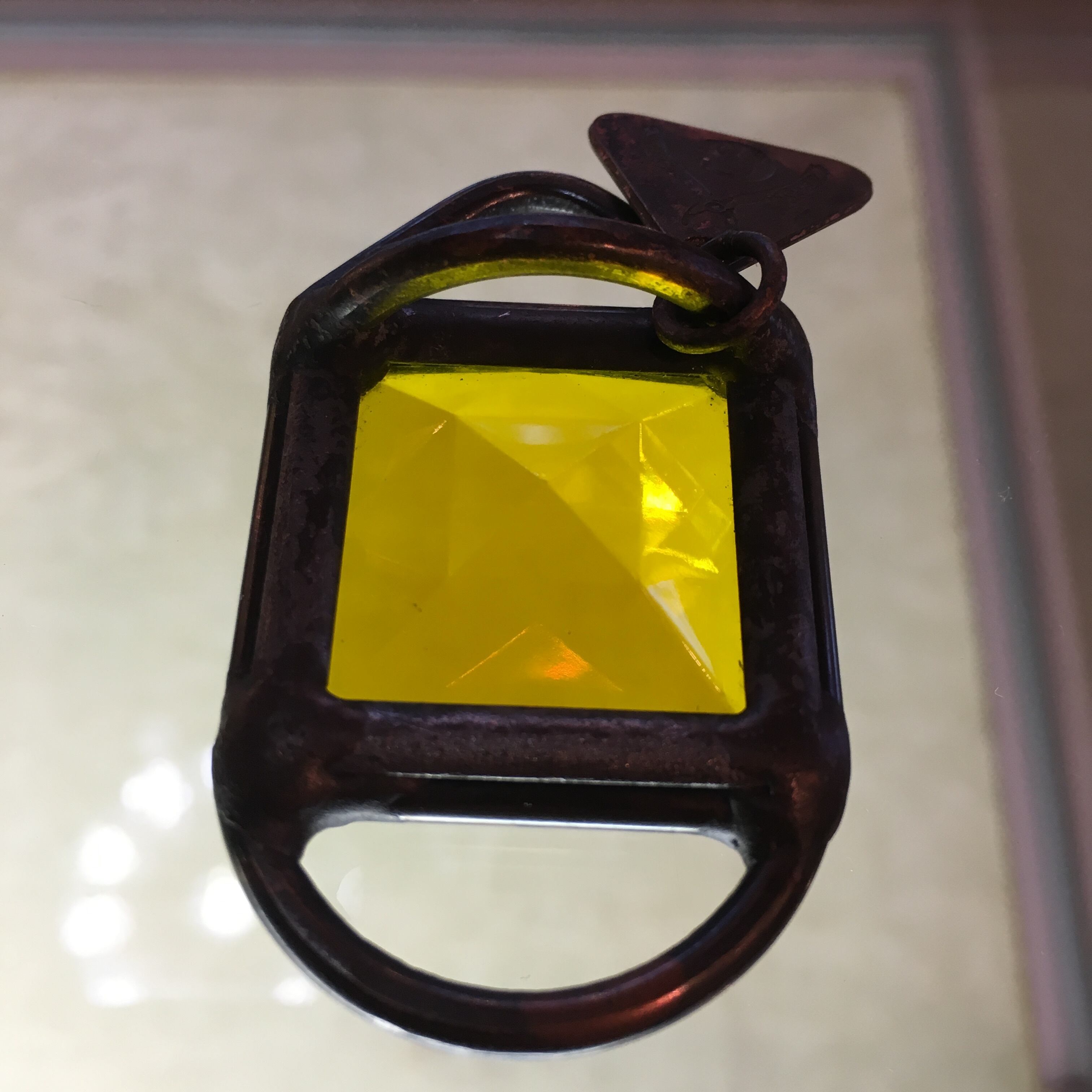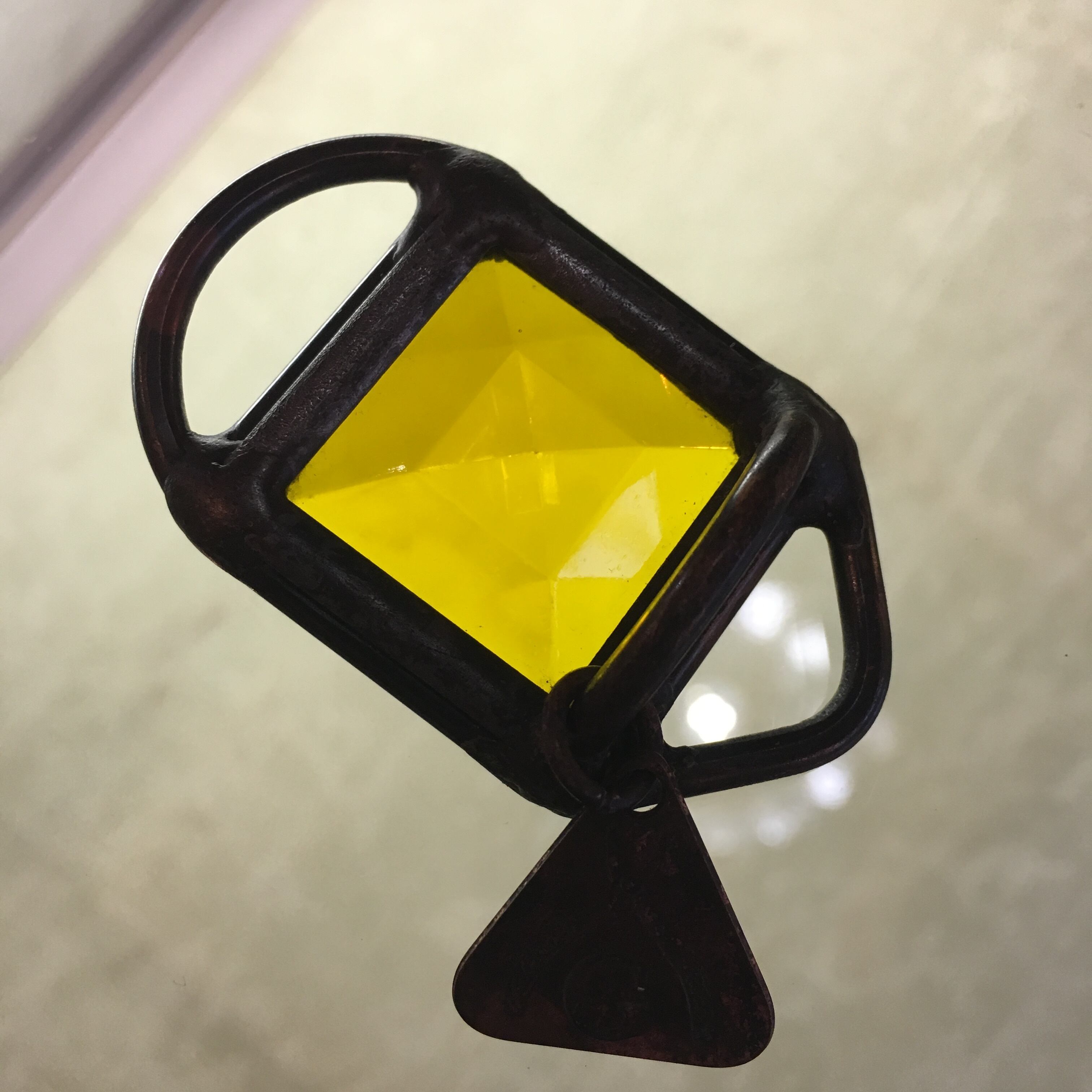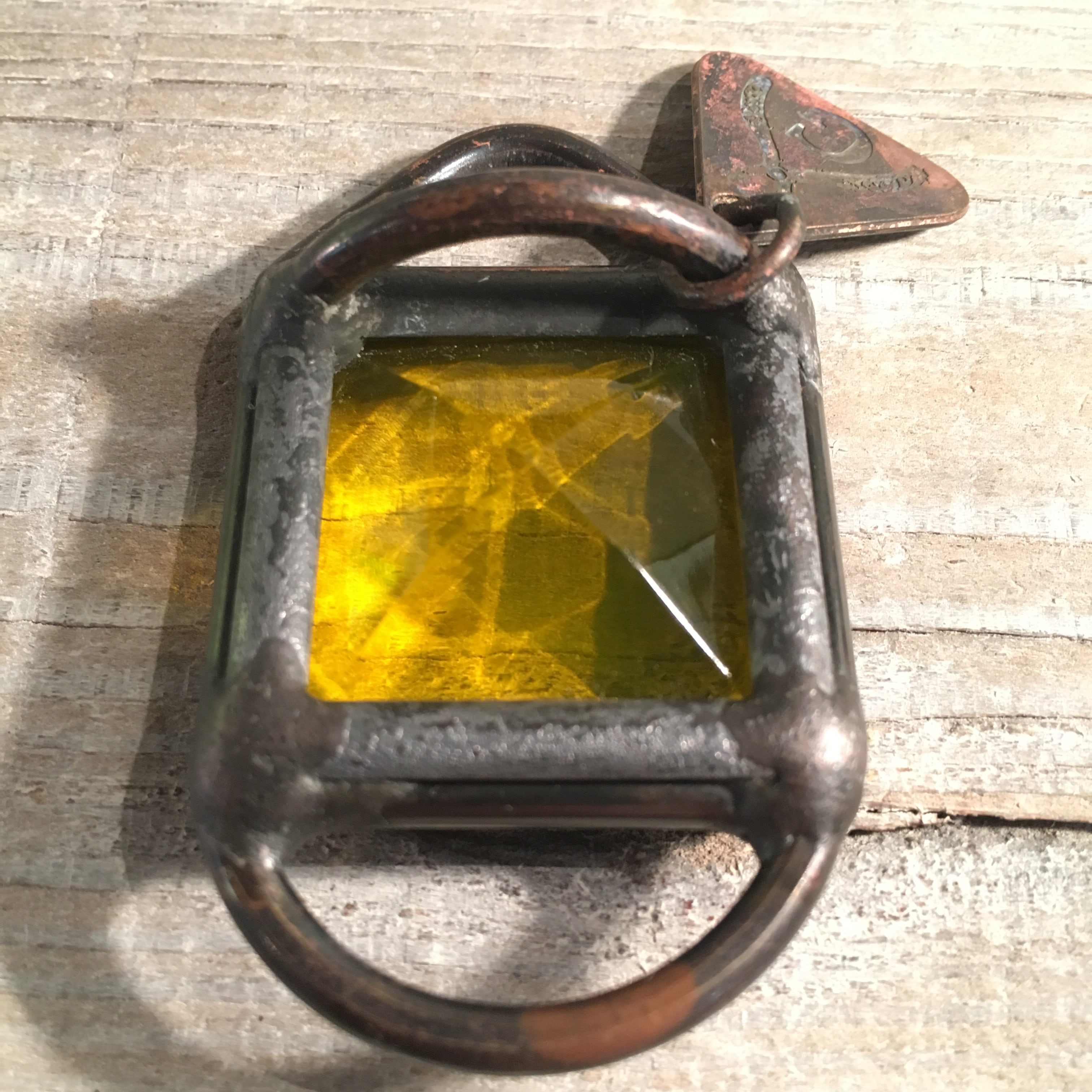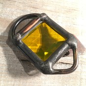 :ステンドグラスの古典技法であるケイム組みパネルに、真鍮棒を加工した補強パーツを溶着した『ステンドグラスの装身具』です。