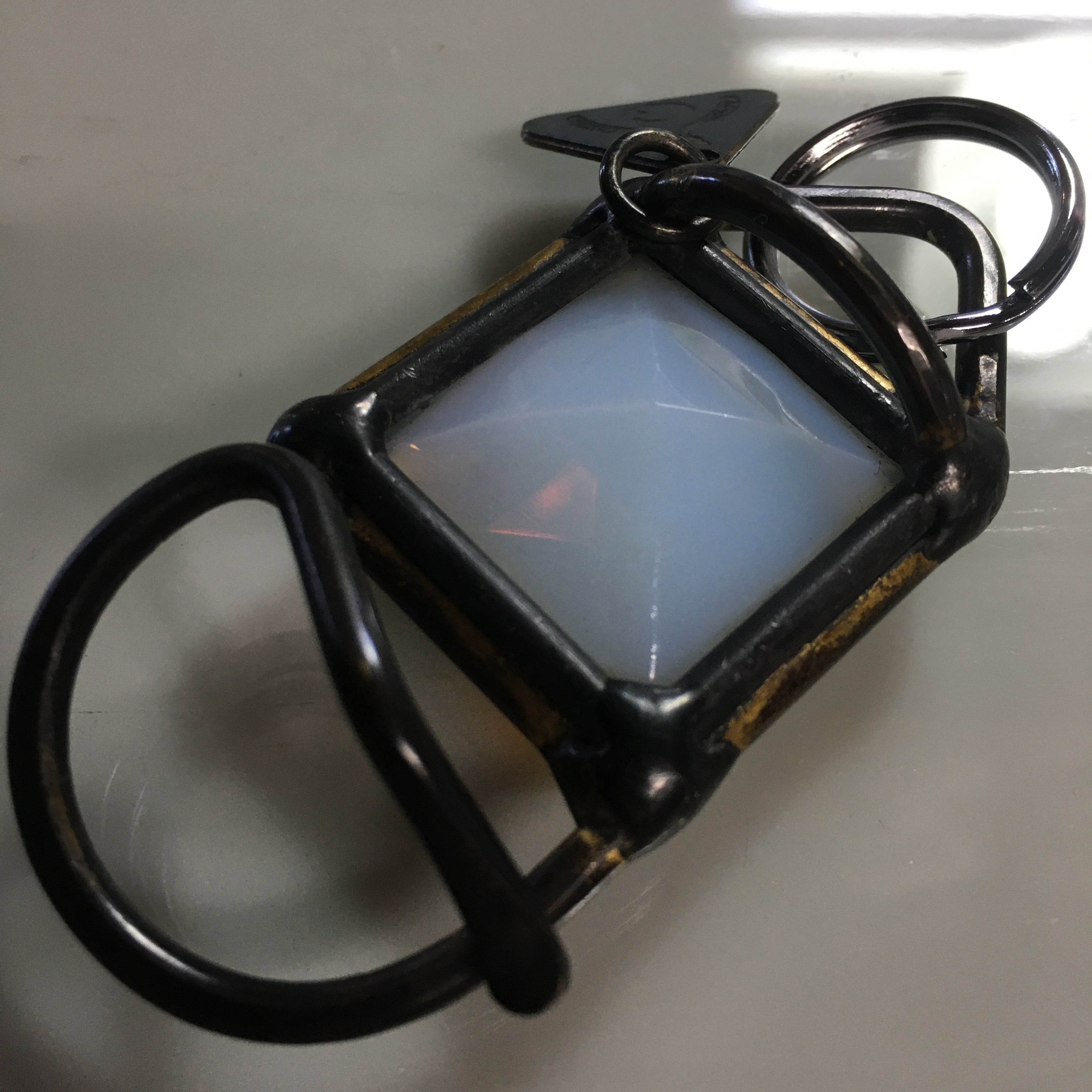 :ステンドグラスの古典技法であるケイム組みパネルに、真鍮棒を加工した補強パーツを溶着した『ステンドグラスの装身具』です。