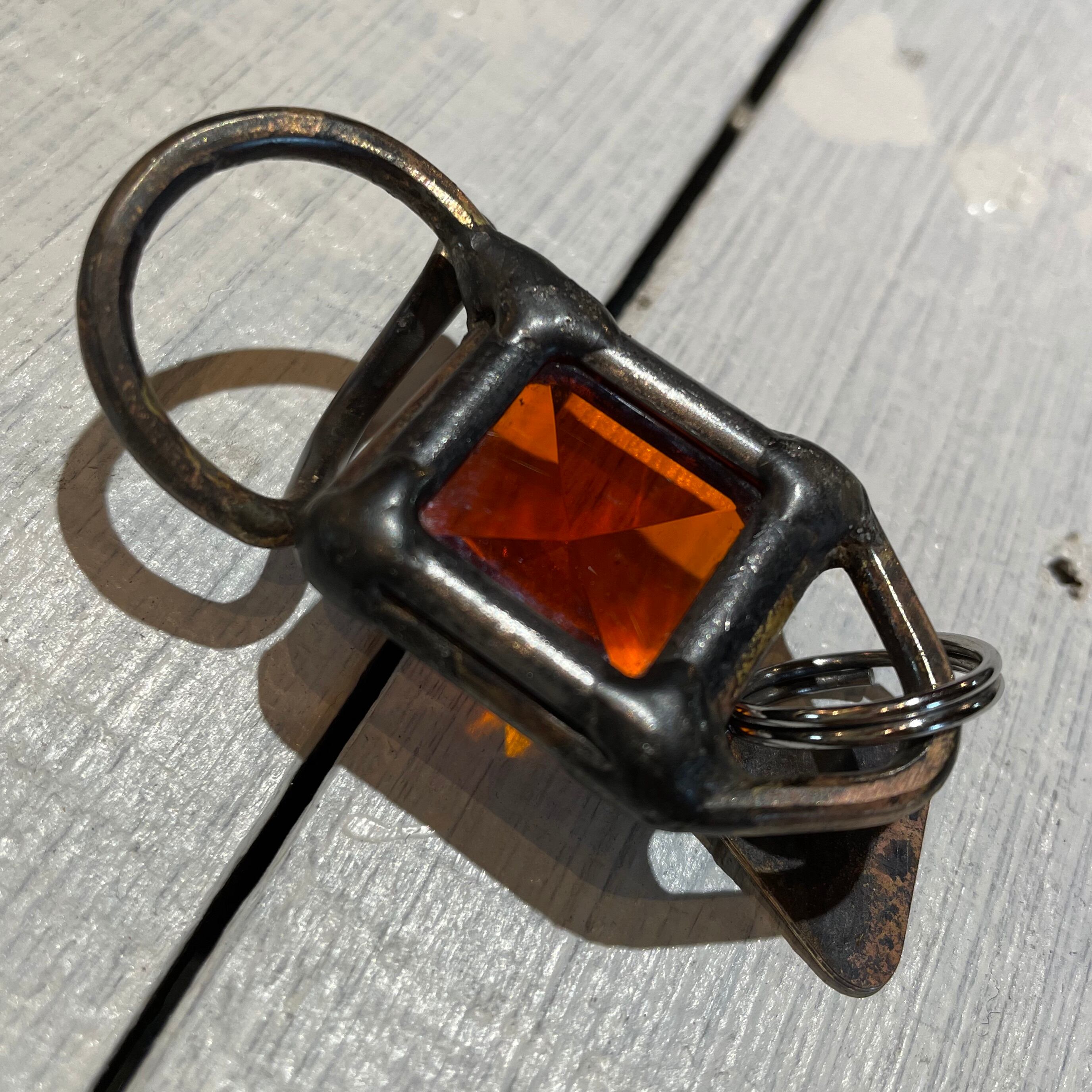 :ステンドグラスの古典技法であるケイム組みパネルに、真鍮棒を加工した補強パーツを溶着した『ステンドグラスの装身具』です。
