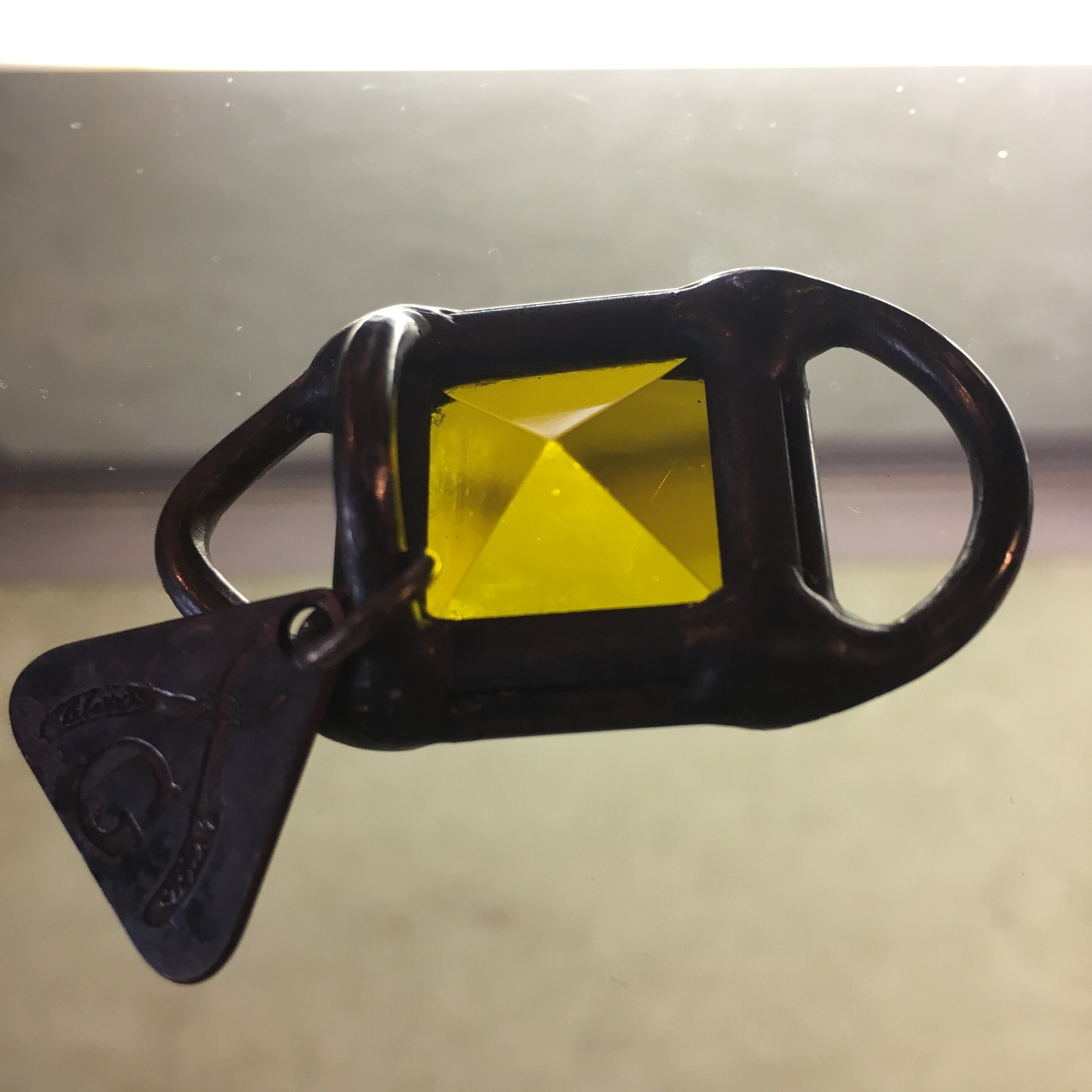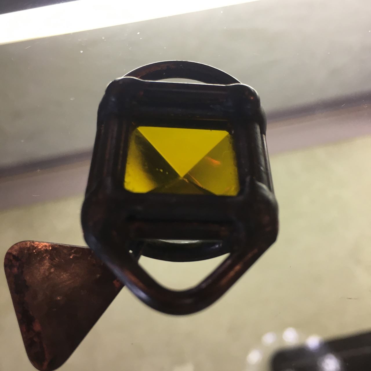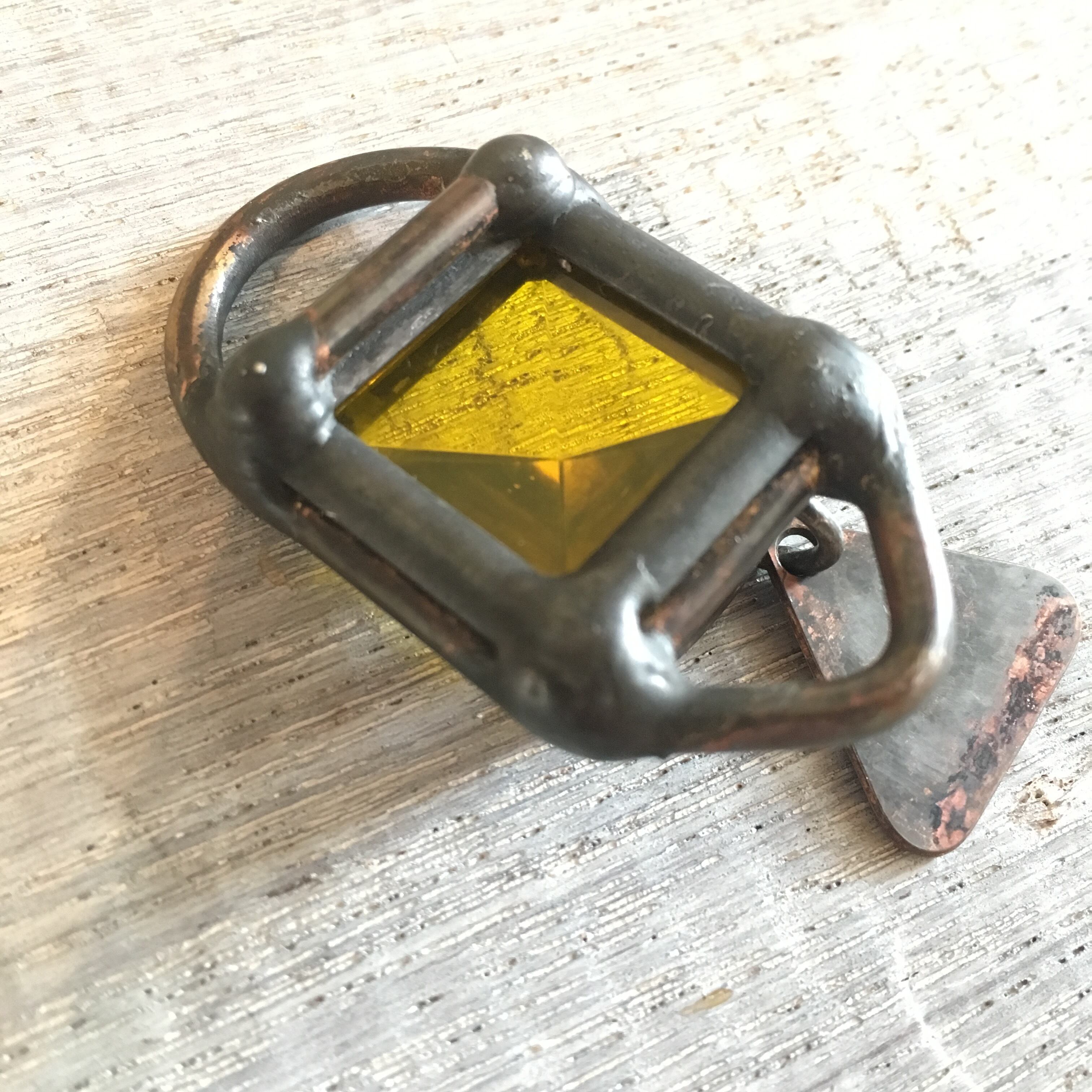:ステンドグラスの古典技法であるケイム組みパネルに、真鍮棒を加工した補強パーツを溶着した『ステンドグラスの装身具』です。