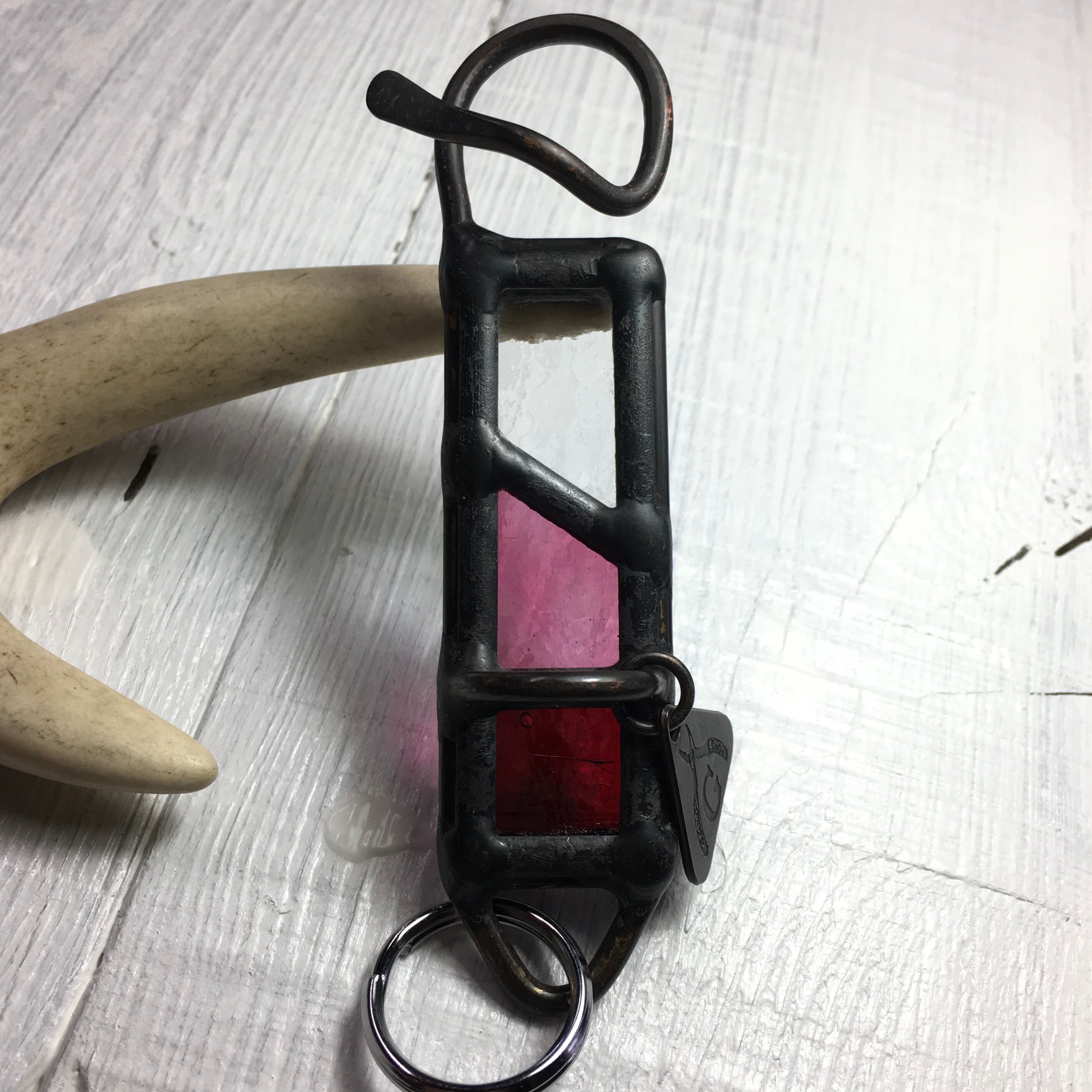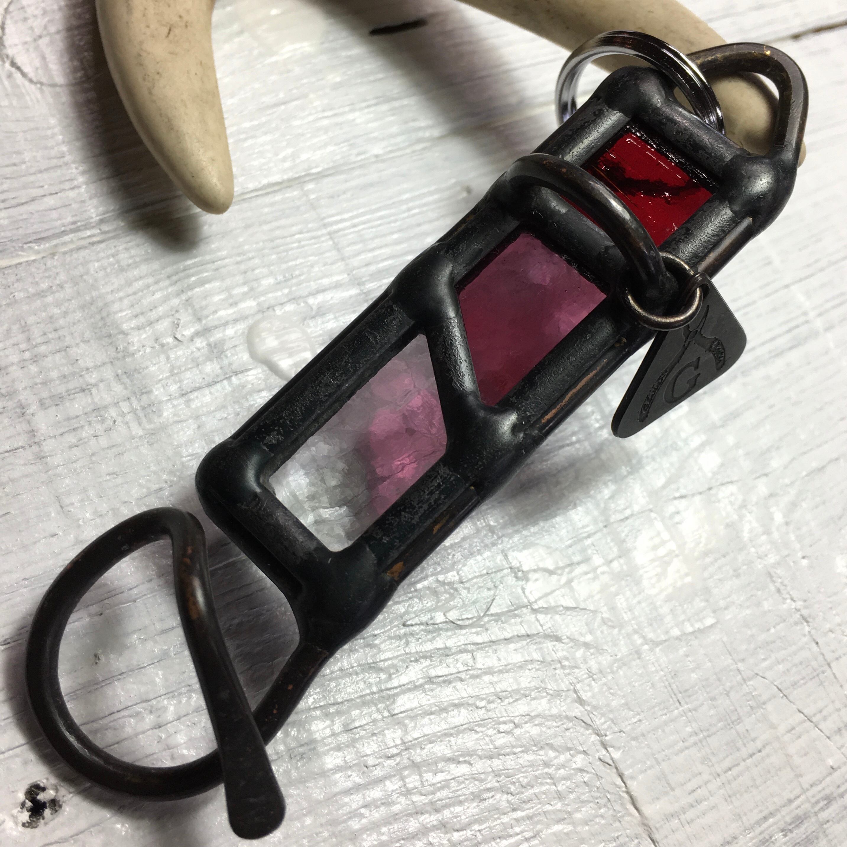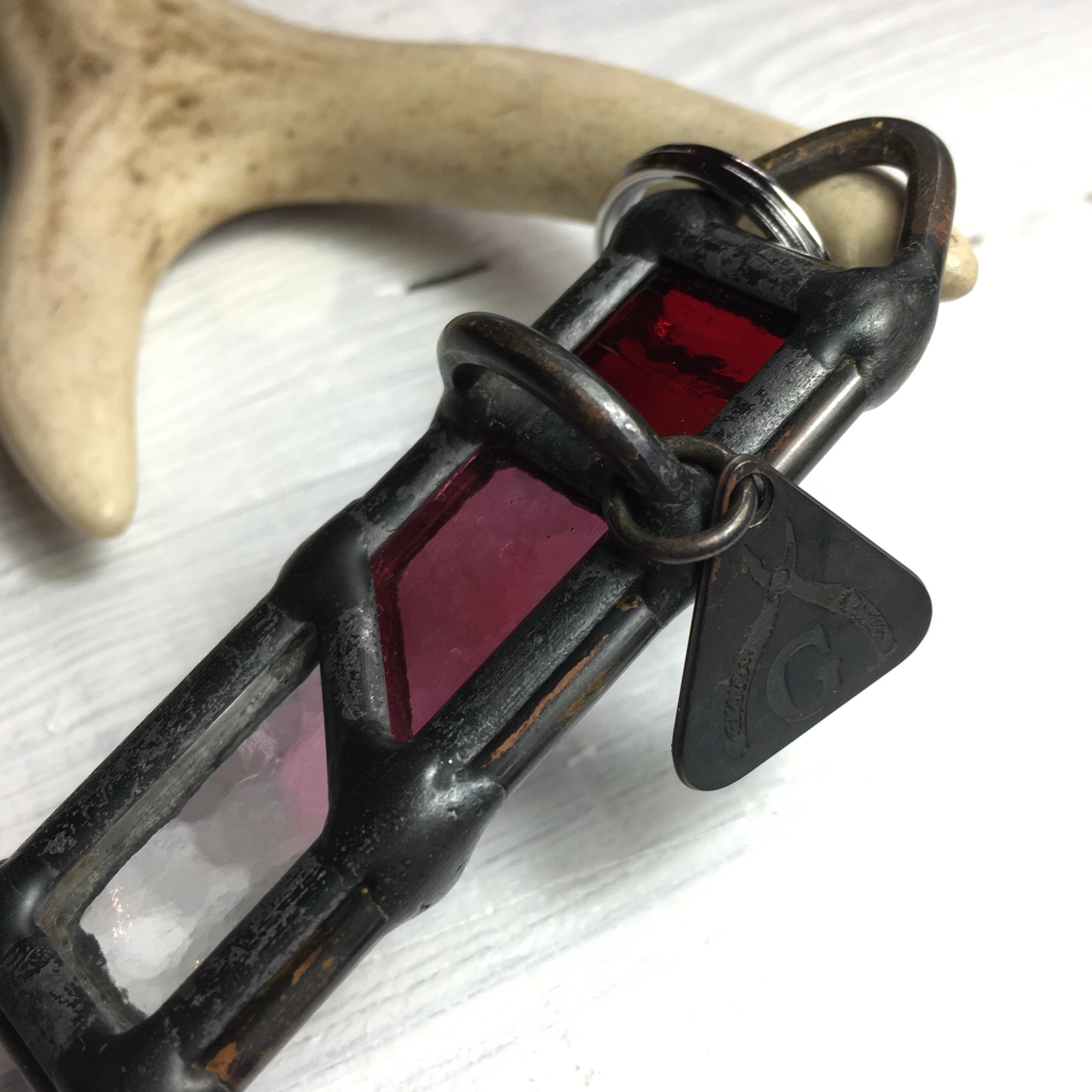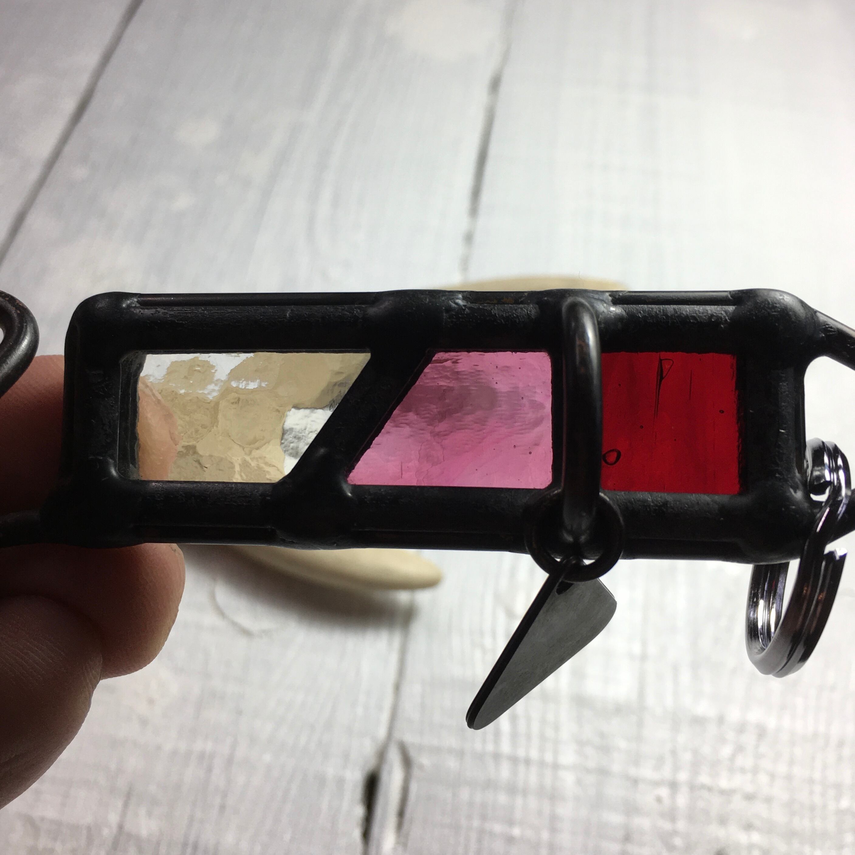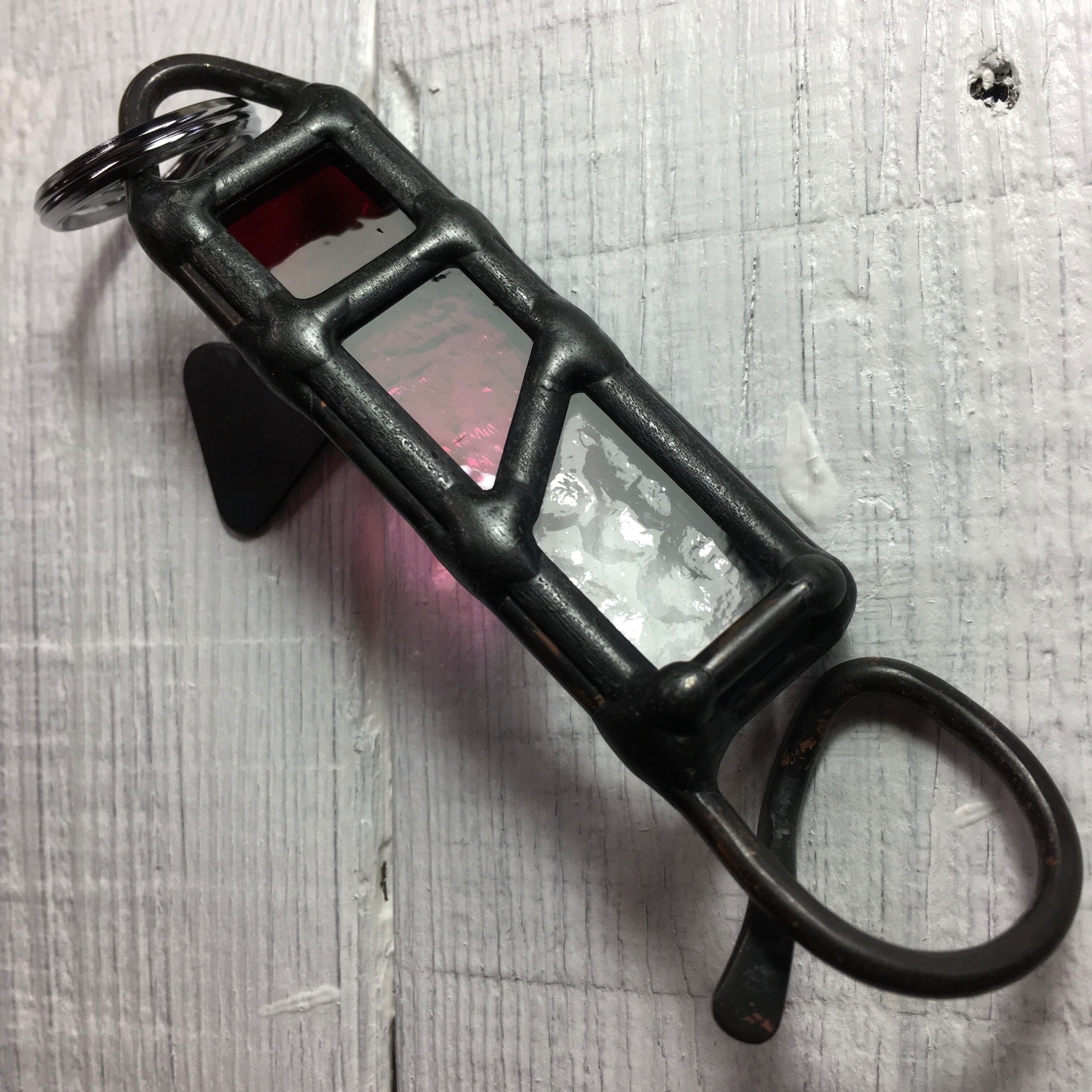 :ステンドグラスの古典技法であるケイム組みパネルに、真鍮棒を加工した補強パーツを溶着した『ステンドグラスの装身具』です。
