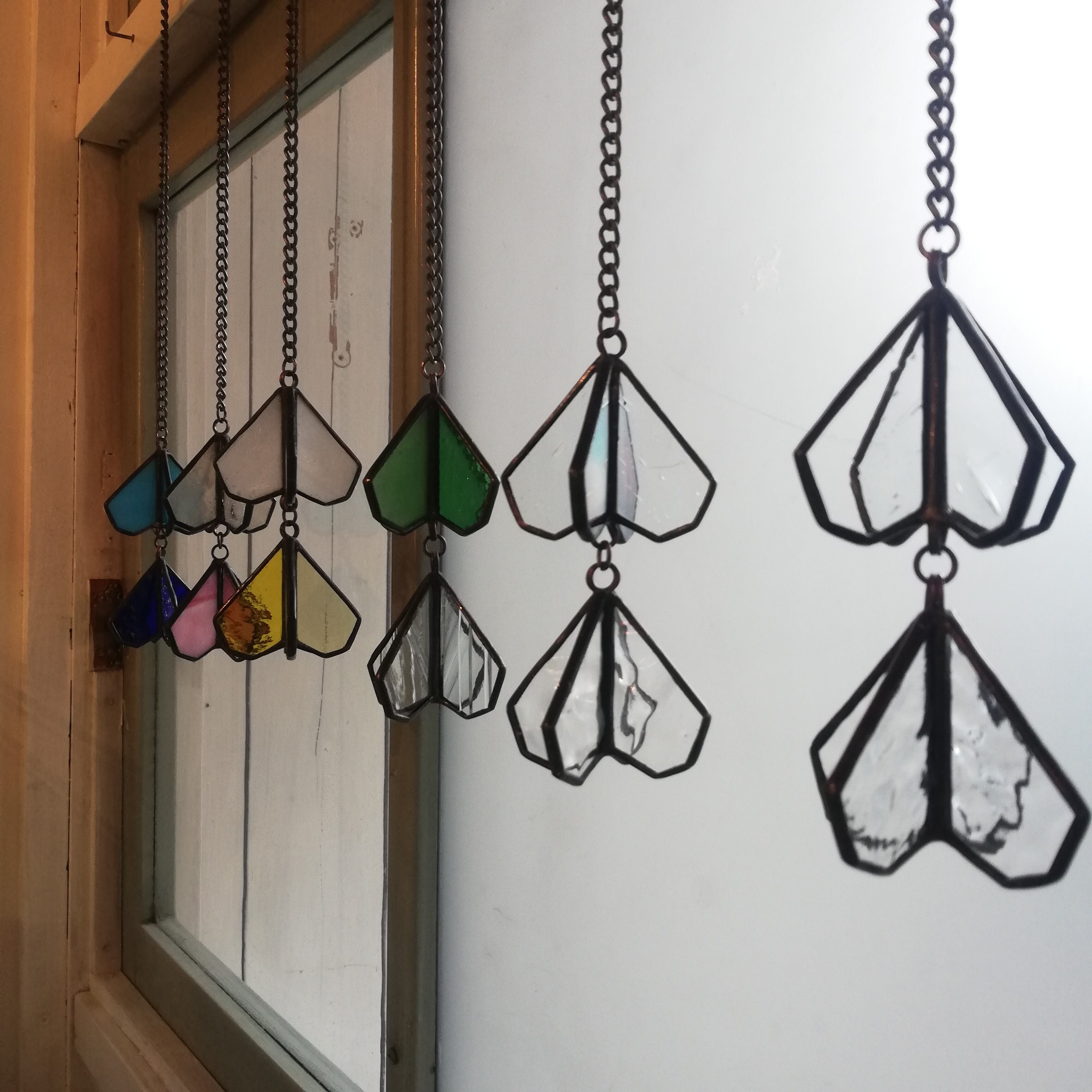 サンキャッチャーと名付けたステンドグラスの吊るし飾り。ドロップサンキャッチャーの2連タイプです。