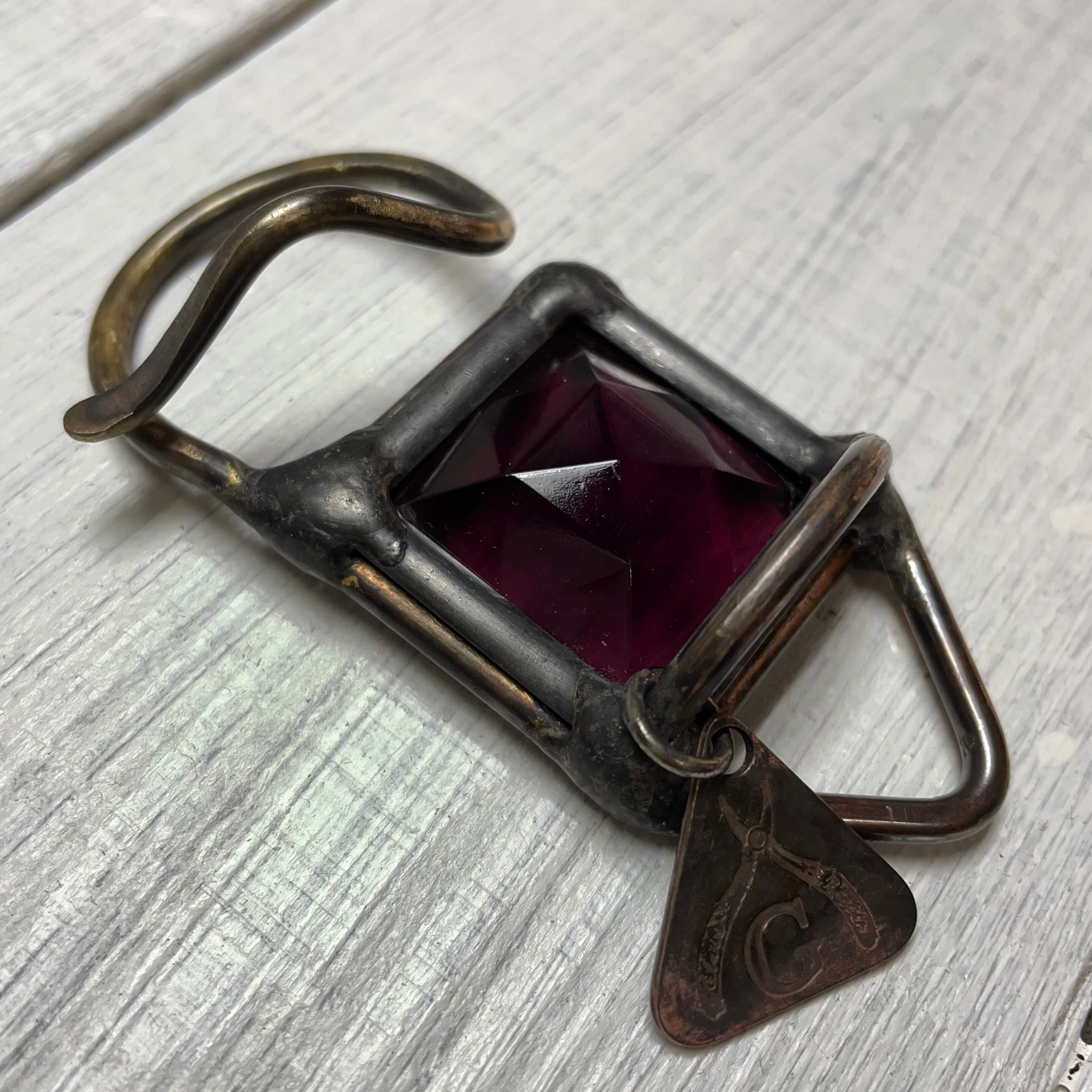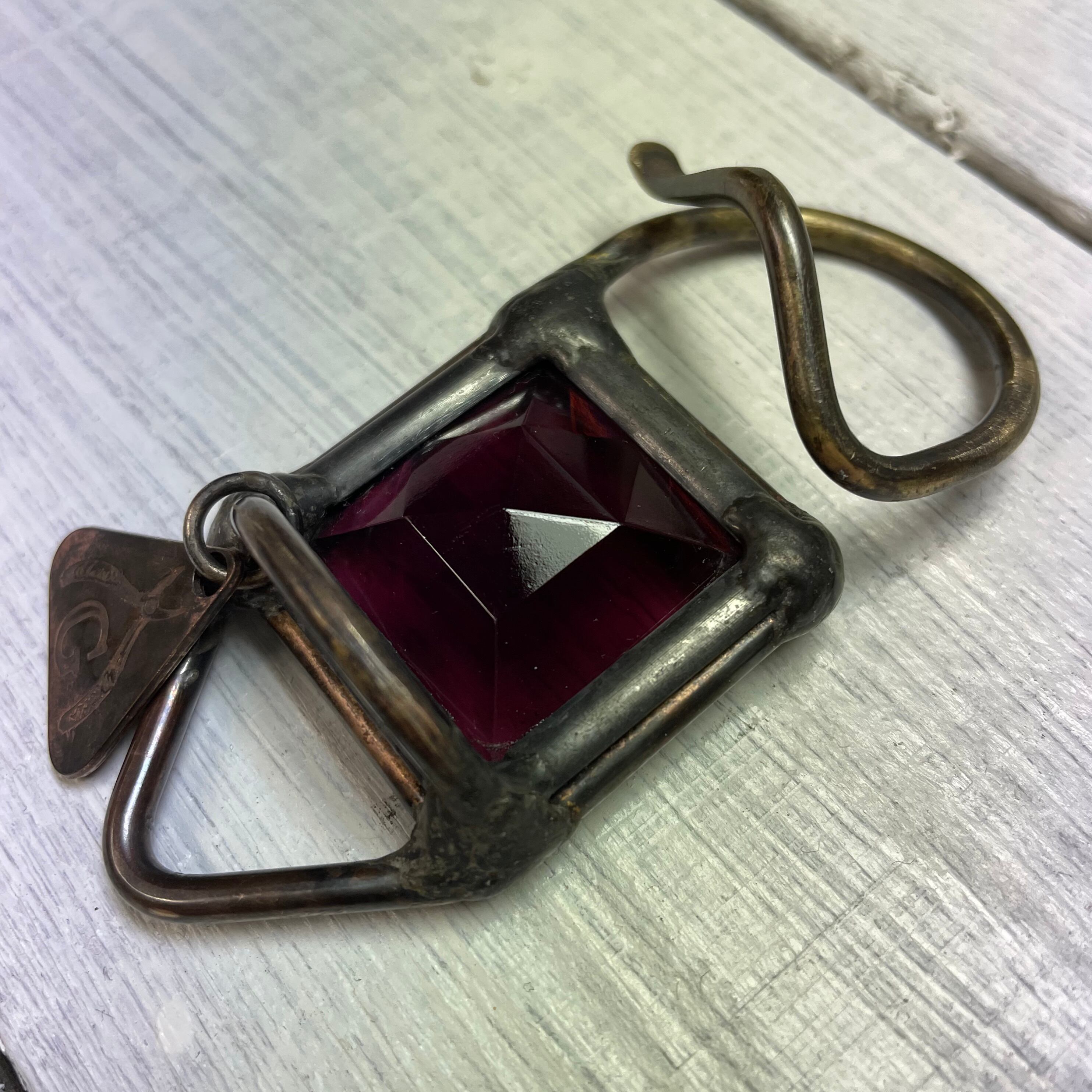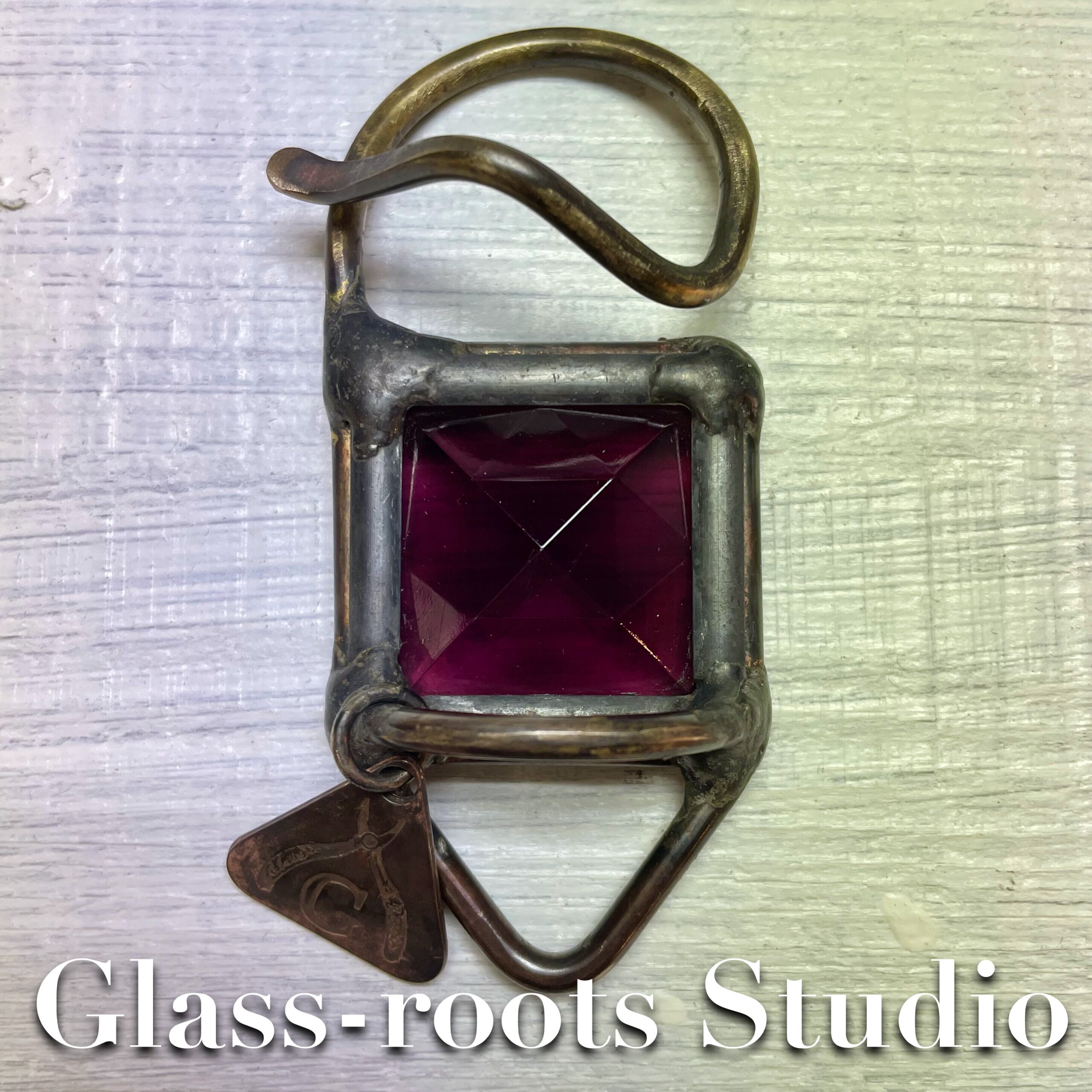 :ステンドグラスの古典技法であるケイム組みパネルに、真鍮棒を加工した補強パーツを溶着した『ステンドグラスの装身具』です。