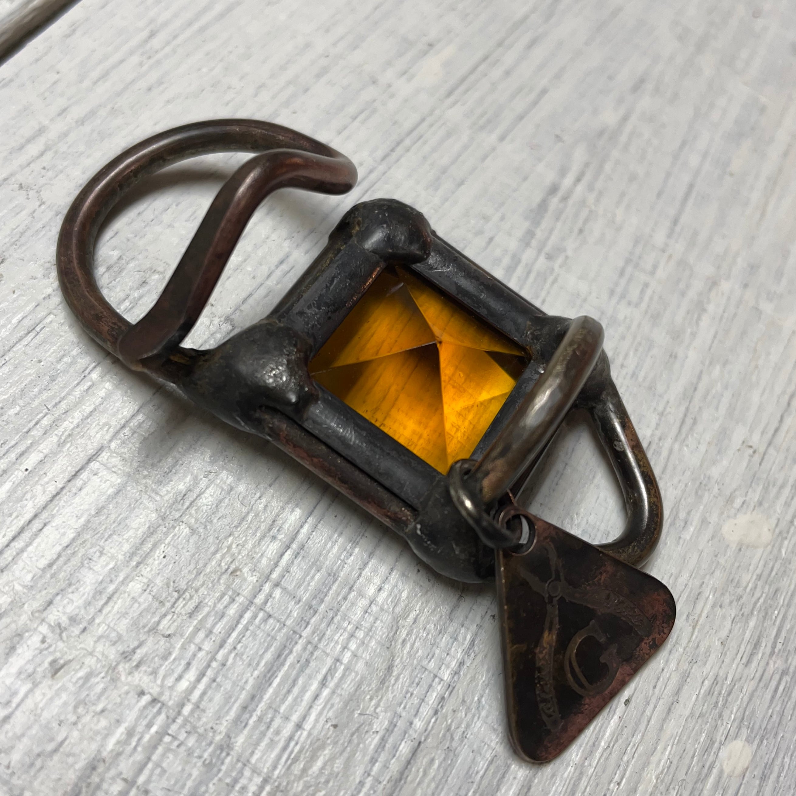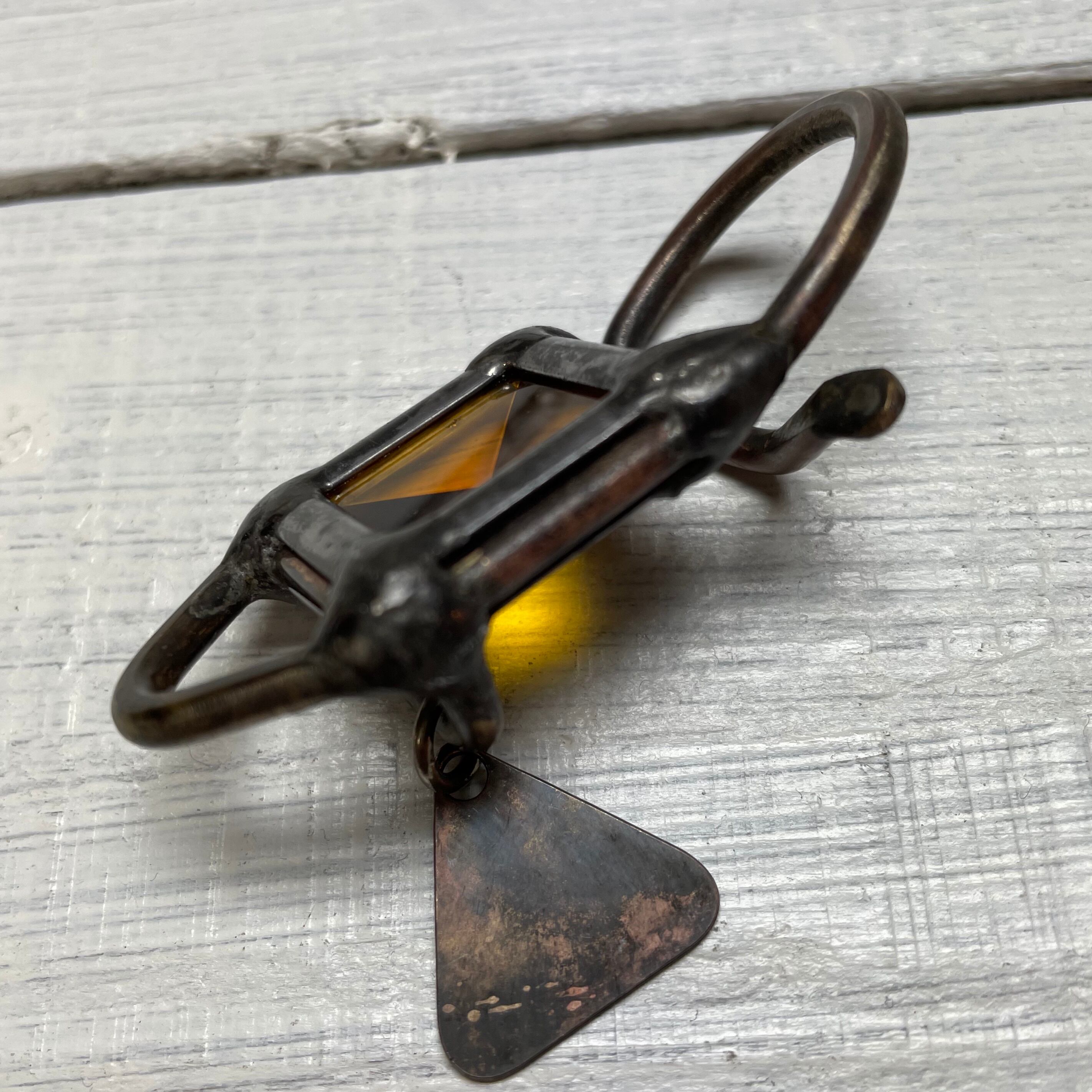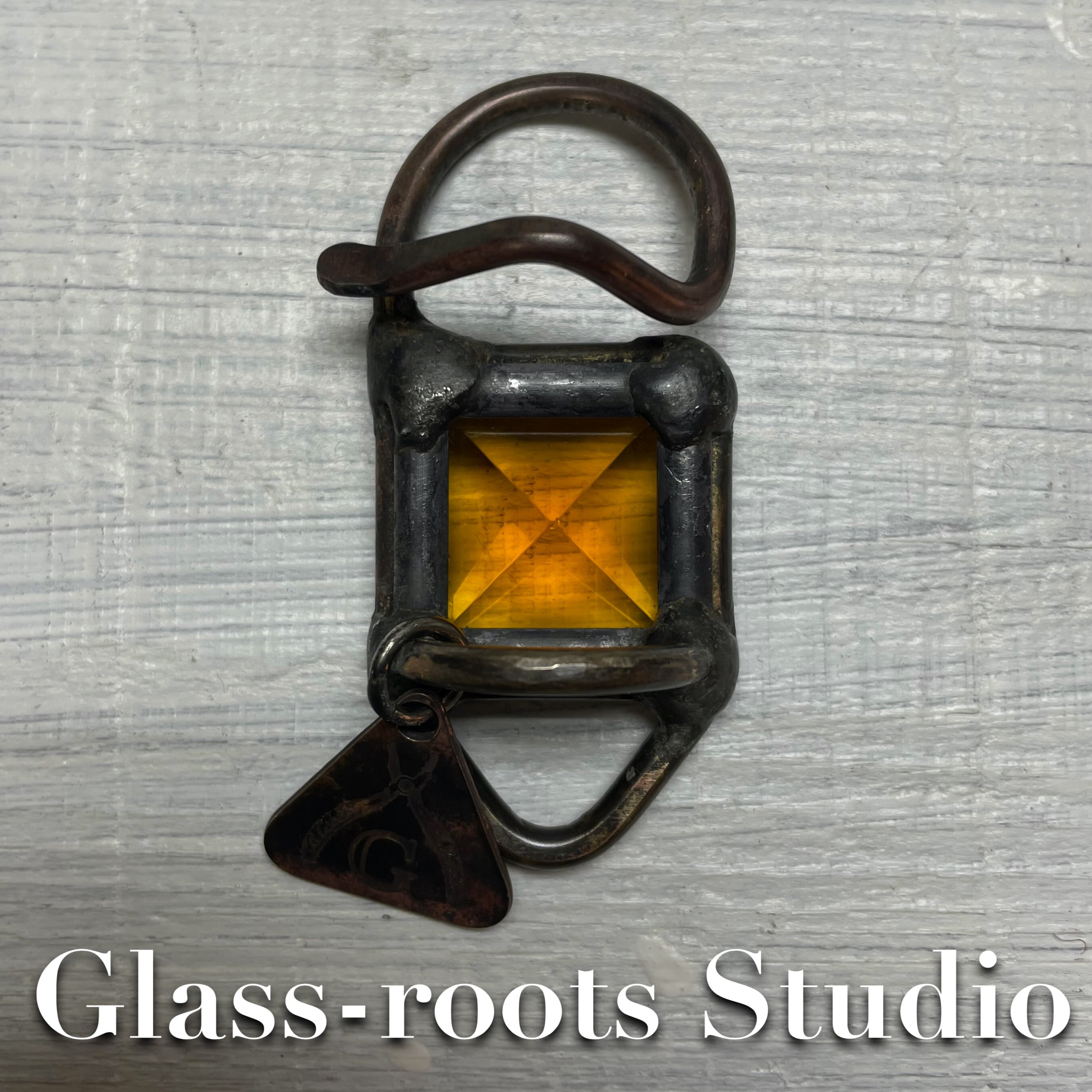 :ステンドグラスの古典技法であるケイム組みパネルに、真鍮棒を加工した補強パーツを溶着した『ステンドグラスの装身具』です。
